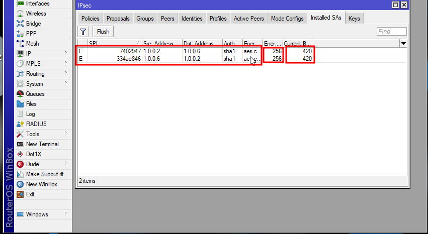 Kita dapat melihat pada destination address 1.0.0.2 dimana terlihat Current bytes 420 yang menandakan adanya paket ke ke destination tersebut menggunakan tunnel VPN Site-to-site