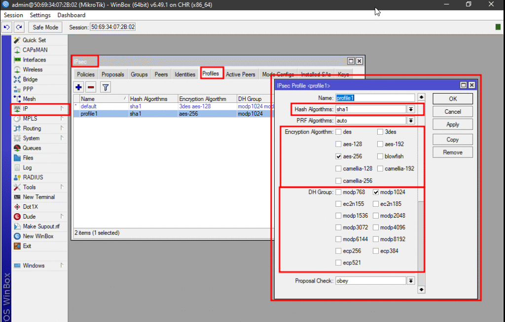 Pada winbox klik menu IP >> IPsec >> Profile. Kemudian tambahkan profile baru. Pada profile isikan parameter-parameter berikut.