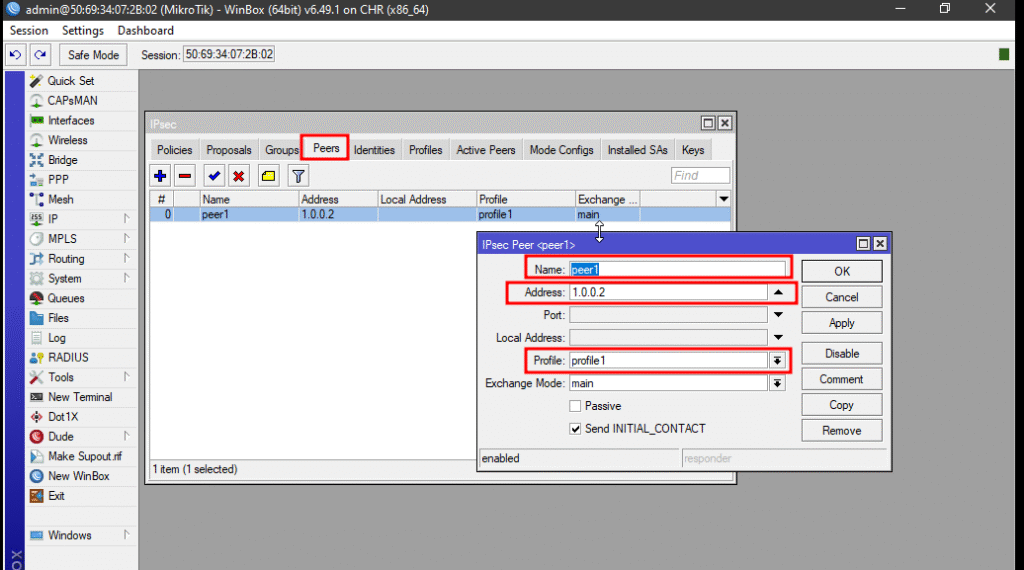 Pada winbox klik menu IP >> IPsec >> Peer . Kemudian tambahkan peer baru. Tambahkan remote address lalu profile .