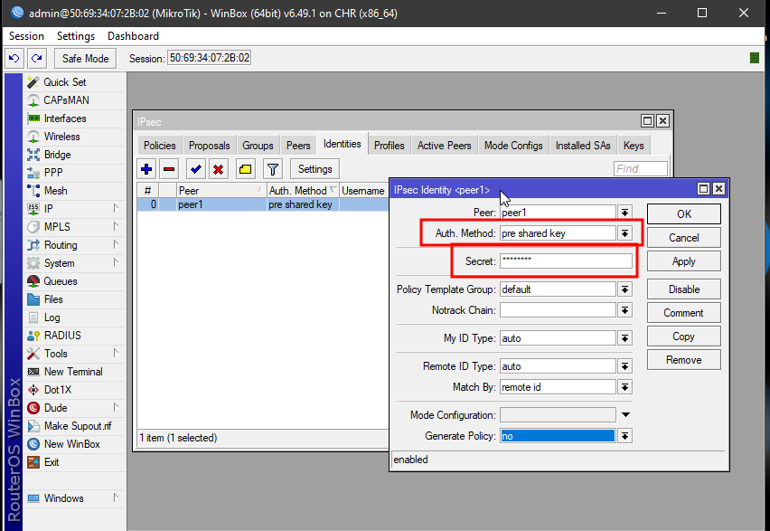 Agar remote dan local dapat berkomunikasi dengan baik maka diperlukan metode autentikasi. Pada artikel ini autentikasi dilakukan dengan pre-shared-key. Pad mikrotik buka IPSec >> Identites lalu masukan method pre-shared-keylalu masukan secret Cisco123 (menyesuaikan dengan secret pada ASA)