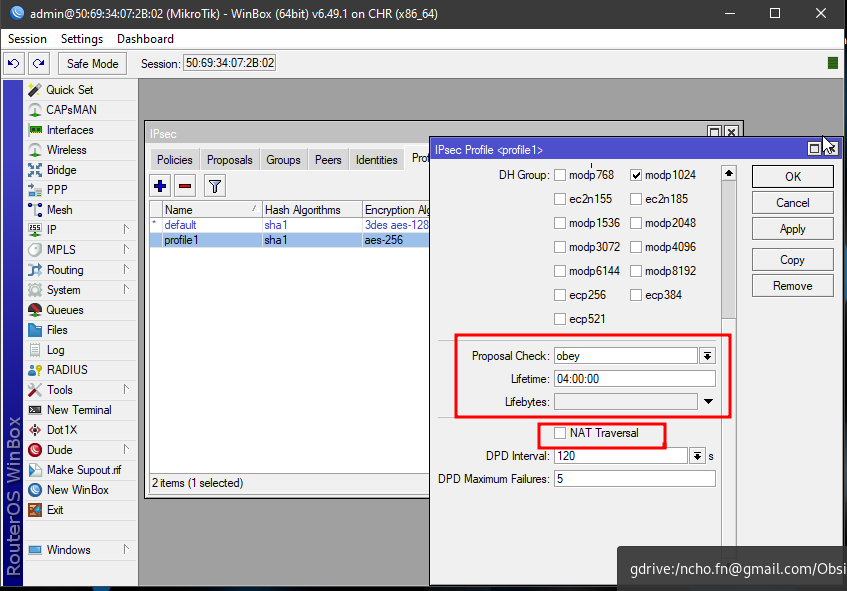 ! encryption, hash untuk authentication param, DH-Group 2, lifetime 4 Jam