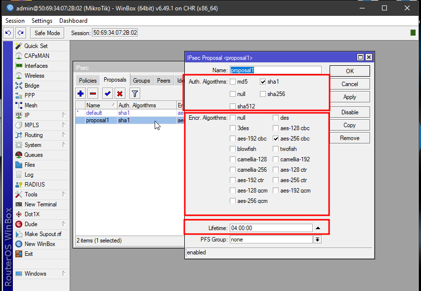 Pada IPSec >> Proposal. Tambahkan konfigurasi sebagai berikut.