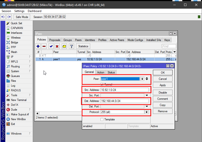 Policies akan digunakan untuk menambahkan koneksi site-to-site pada routerOS mikrotik. Untuk memulai konfigurasi buka IPSec >> Policies >> kemudian tambahkan konfigurasi berikut